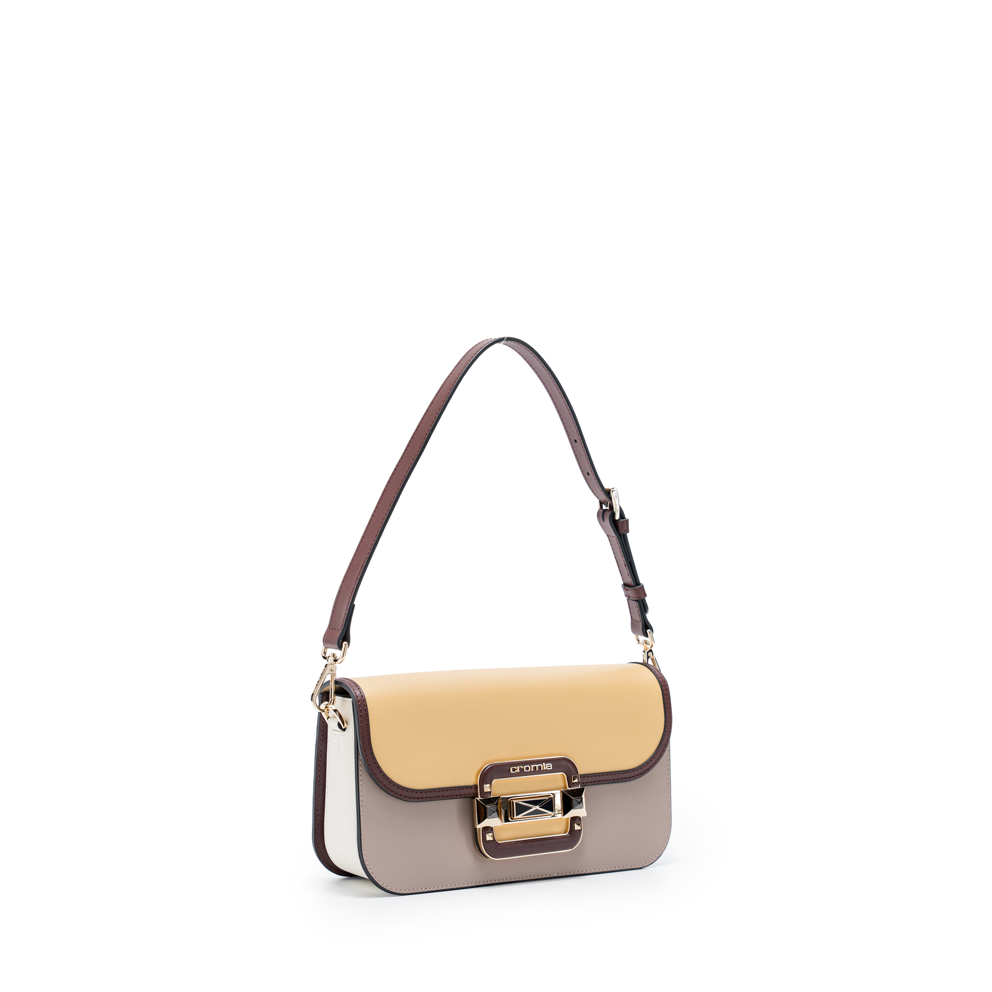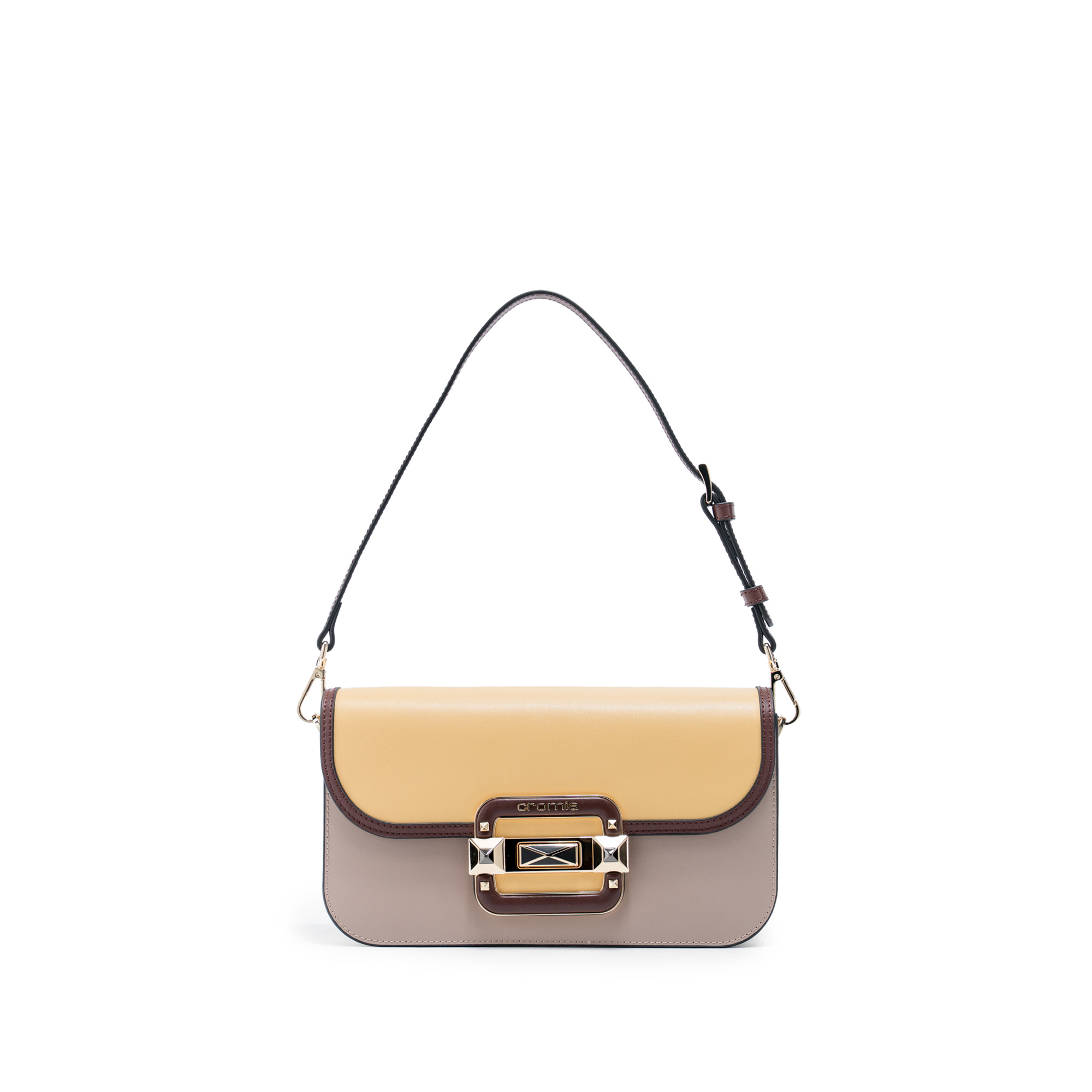 Điểm nổi bật: Chiếc túi xách nữ Cromia IT JEWEL – Vàng Mostarda 1406054-MOS thuộc BST IT JEWEL, một lời thì thầm Ý đầy quyền lực. Phom dáng mini flap vuông vức: nắp gập ôm sát, dây da đeo vai ngắn + dây xích kim loại tháo rời linh hoạt. Sắc Mostarda vàng mù tạt rực rỡ như nắng thu Tuscany, da bê mịn ôm sát đường viền đen táo bạo, dẫn ánh nhìn đến phần khóa xoay Cromia đặc trưng, như một viên kim cương không thể nhầm lẫn. Bố cục 3 màu Mostarda – Nero – Taupe như một bức tranh Ý: vàng chủ đạo, đen viền sắc, taupe nền trầm, không ồn ào nhưng khiến người khác phải dừng lại ngắm nhìn.