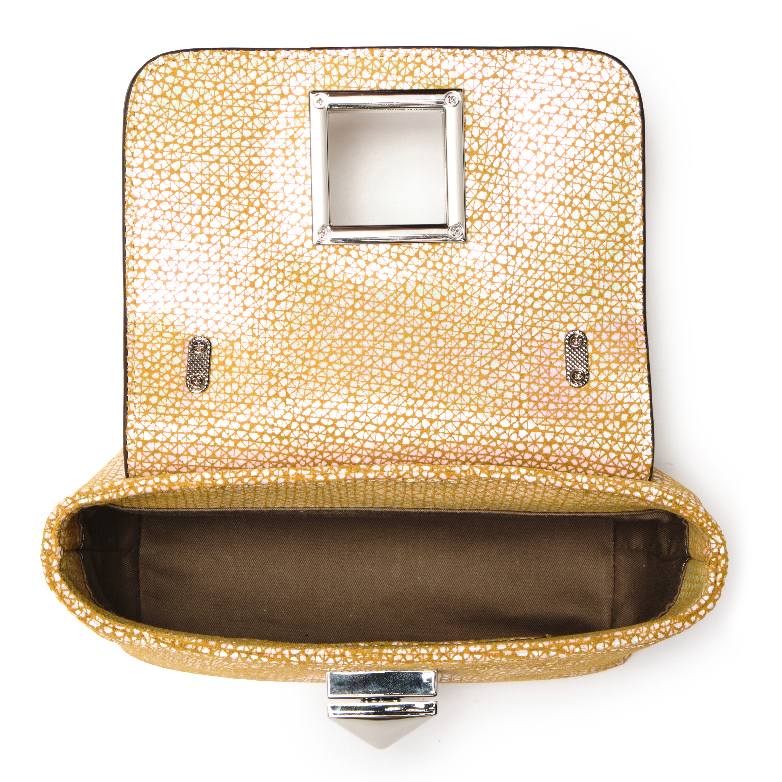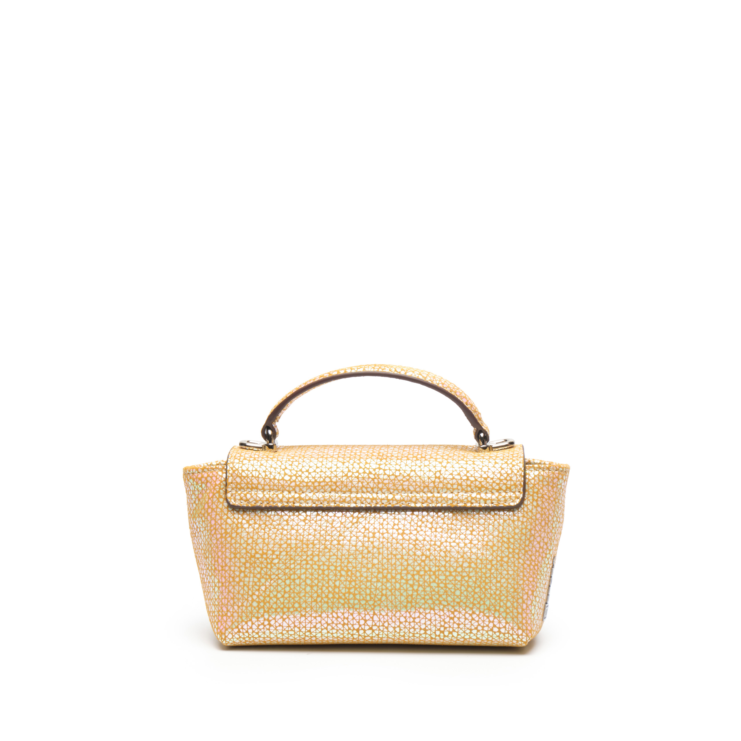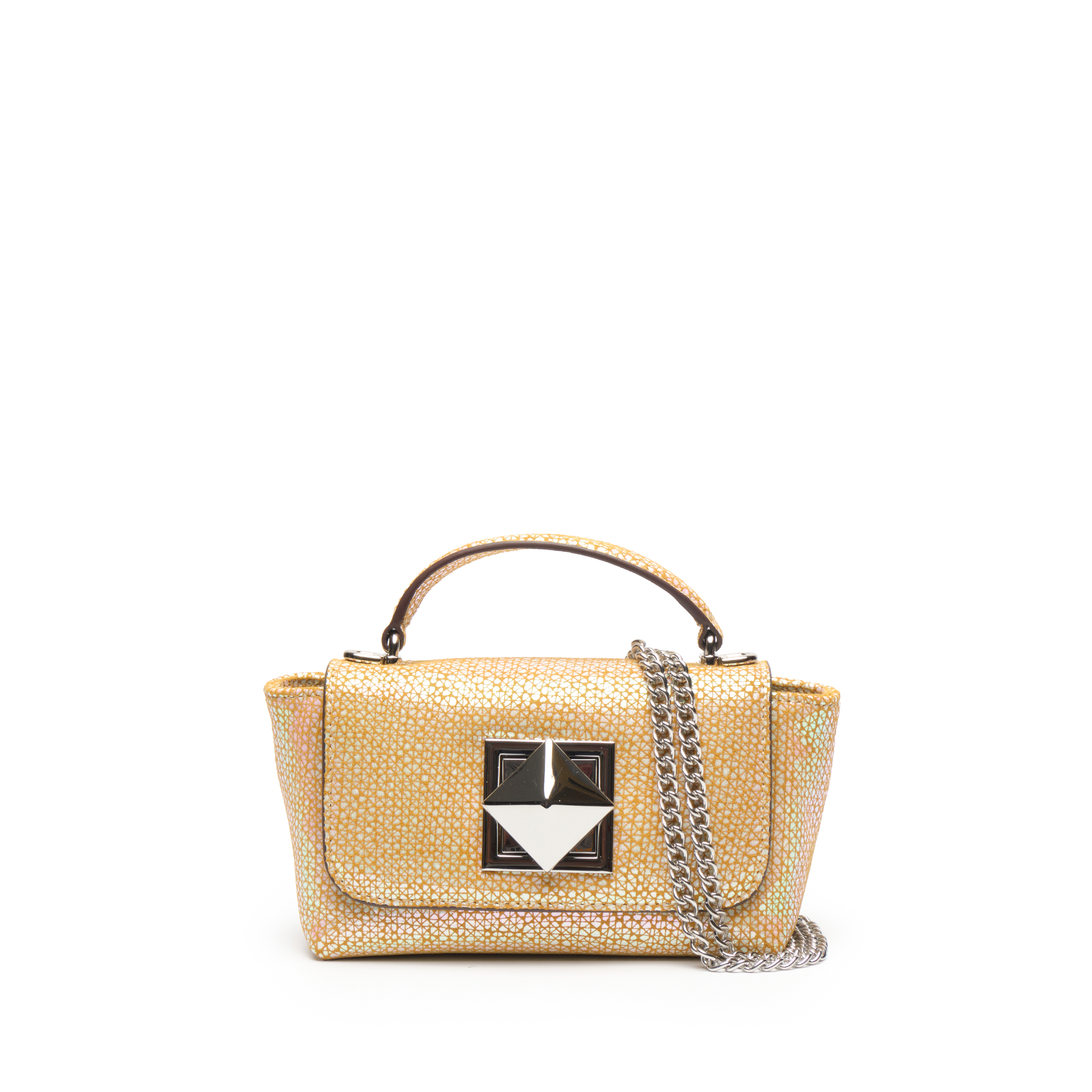 Điểm nổi bật: Thiết kế túi xách nữ top-handle bag EFORA 4-EFA-76503-DB-01-YEL/WHI mang vẻ đẹp tinh tế và cuốn hút với chất liệu da bò lớp 1 cao cấp phủ vân lưới hình học mosaic kết hợp hiệu ứng iridescent ánh xà cừ đa sắc, tạo bề mặt bắt sáng sinh động, nhẹ nhàng chuyển động theo từng góc nhìn, gợi cảm giác như ánh ngọc trai phản chiếu. Phom túi nhỏ gọn, nắp gập thanh lịch kết hợp khóa kim loại hình khối vuông hiện đại, thông minh tạo nên sự cân bằng giữa nét nữ tính và vẻ sắc sảo tinh giản. Quai xách cong duyên dáng cùng dây đeo dạng xích linh hoạt giúp dễ dàng ứng dụng trong nhiều hoàn cảnh. Mọi chi tiết đều được chế tác sắc nét, nổi bật trên nền họa tiết sống động độc đáo, khẳng định tư duy thẩm mỹ sắc sảo và dấu ấn cá nhân độc bản của người sở hữu.