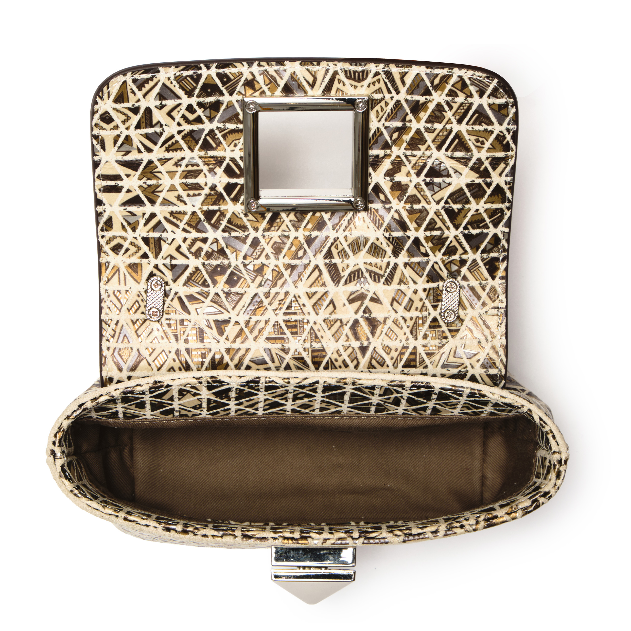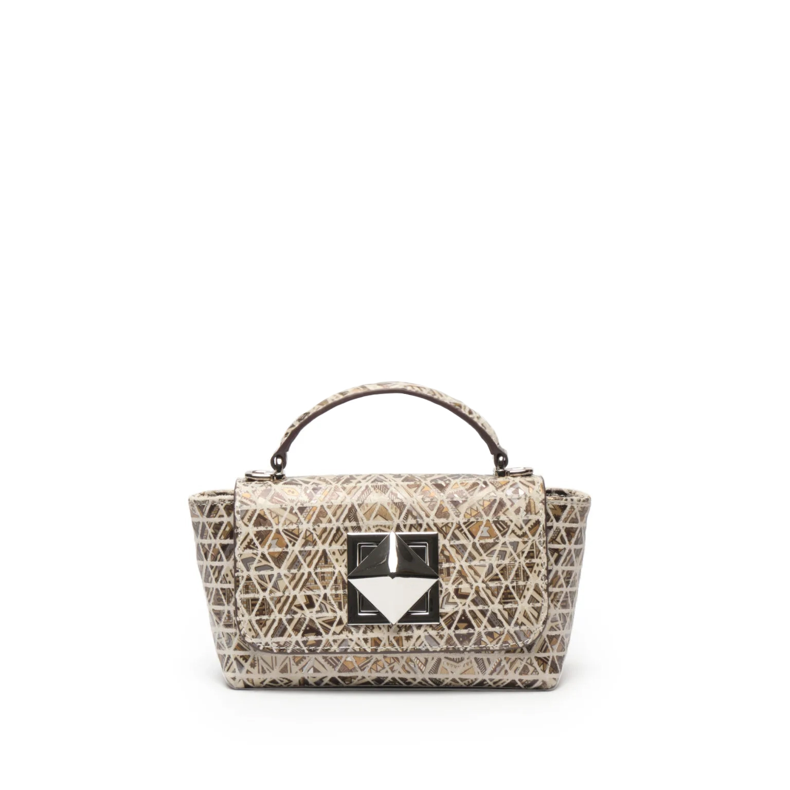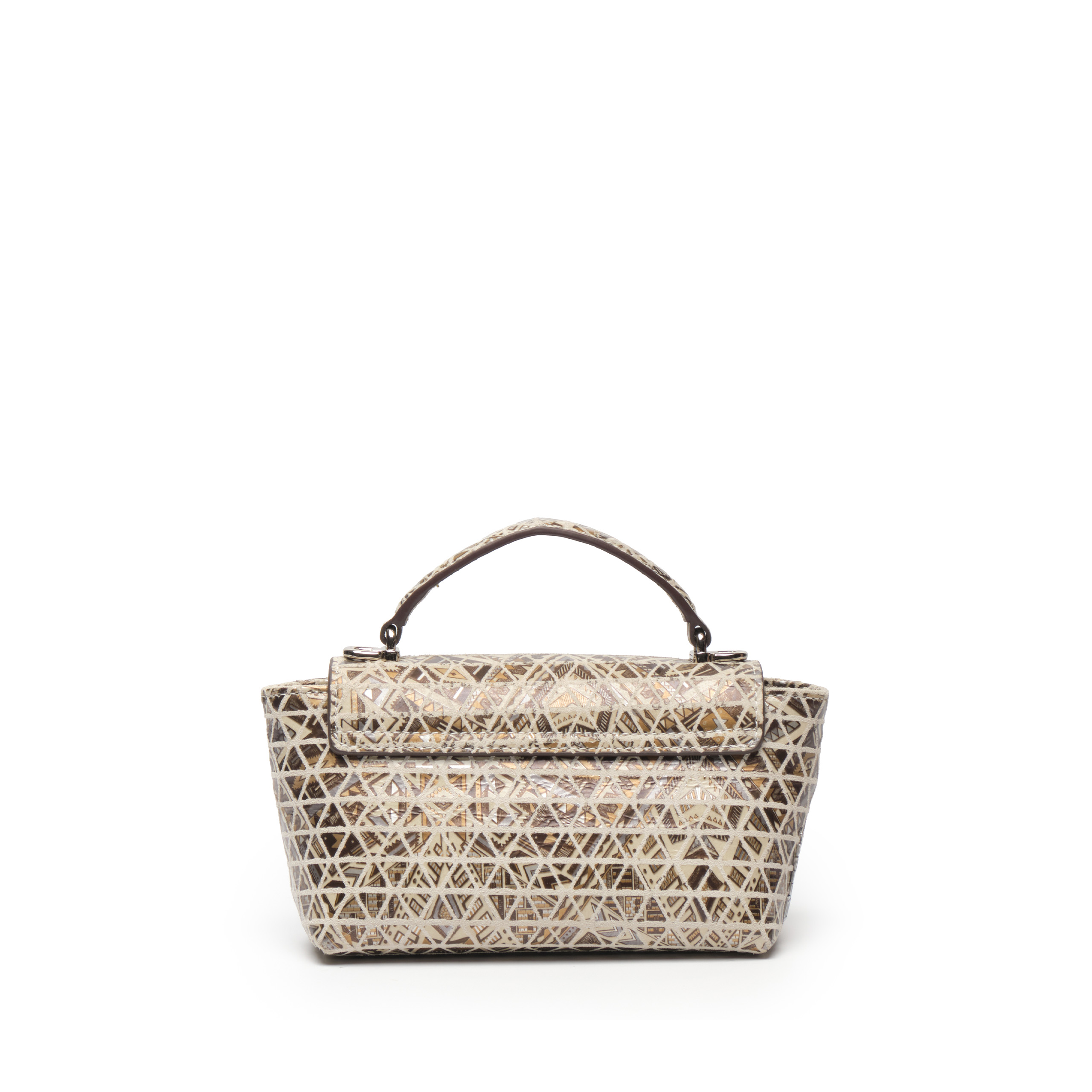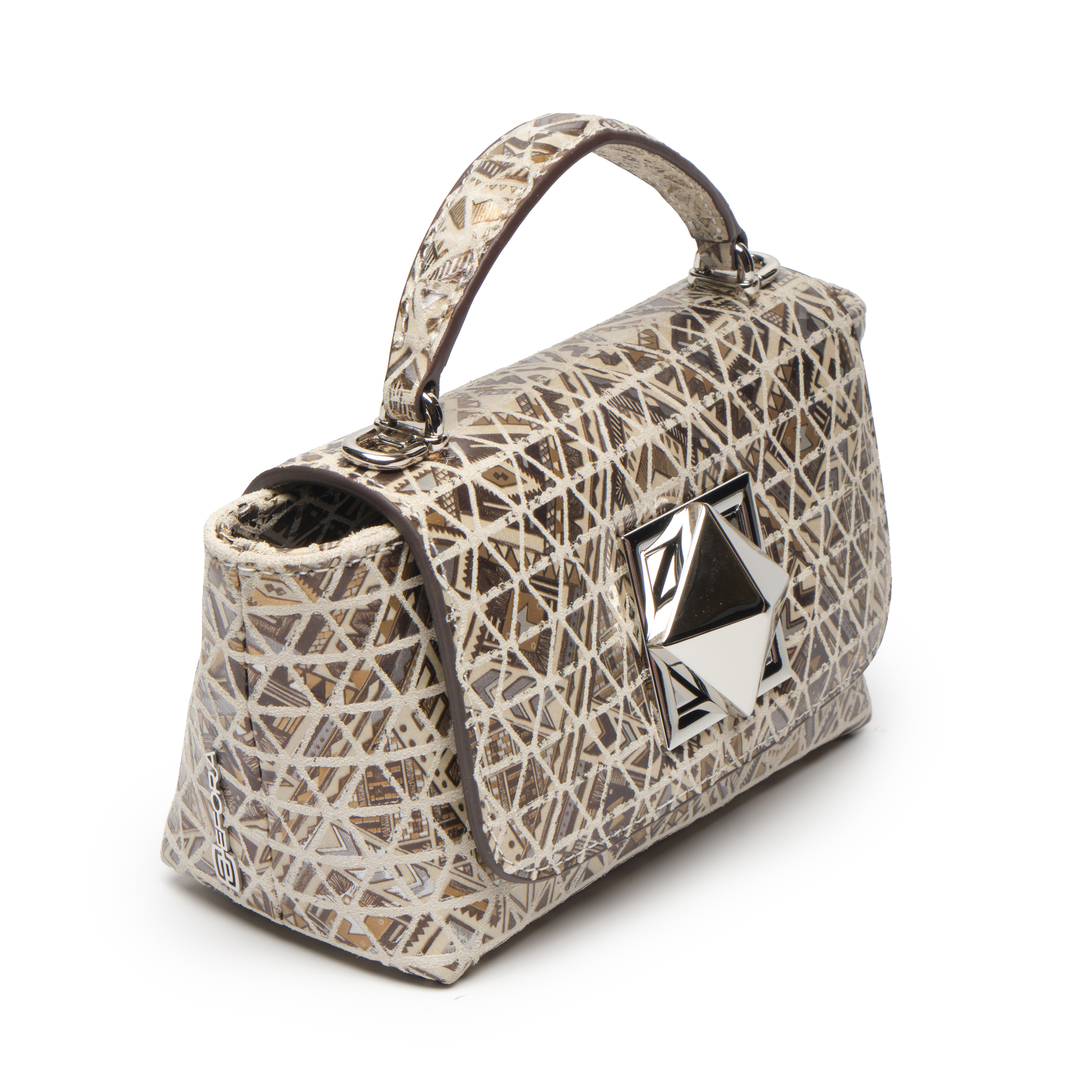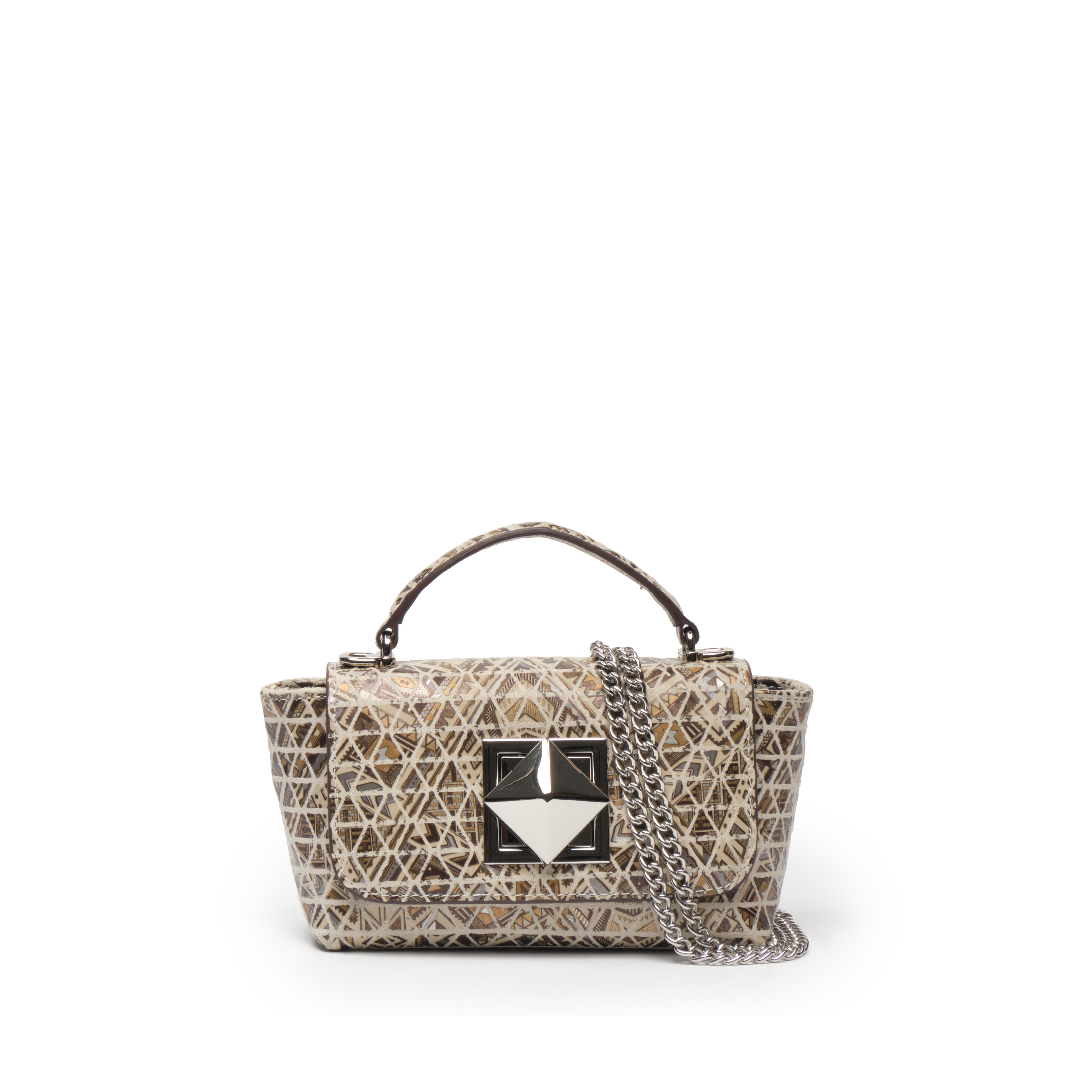 Điểm nổi bật: Bắt trọn nhịp điệu sáng tạo của thời trang đương đại, túi xách tay nữ dáng  top-handle khoá khối EFORA 4-EFA-76503-DB-01-GRE gây ấn tượng mạnh mẽ với bề mặt da bò lớp 1 được phủ họa tiết Mosaic đầy nghệ thuật. Hoạ tiết đan cài những mảng tam giác đối xứng được sắp xếp ngẫu hứng nhưng đầy tính toán trên nền sắc vàng kim, be và nâu trầm, tạo nên một bề mặt sống động như những mảnh ghép kính vạn hoa. Phom túi nhỏ gọn, nắp gập thanh lịch kết hợp khóa kim loại hình khối vuông hiện đại, thông minh tạo nên sự cân bằng giữa nét nữ tính và vẻ sắc sảo tinh giản. Quai xách cong duyên dáng cùng dây đeo dạng xích linh hoạt giúp dễ dàng ứng dụng trong nhiều hoàn cảnh. Mọi chi tiết đều được chế tác sắc nét, nổi bật trên nền họa tiết sống động độc đáo, khẳng định tư duy thẩm mỹ sắc sảo và dấu ấn cá nhân độc bản của người sở hữu.